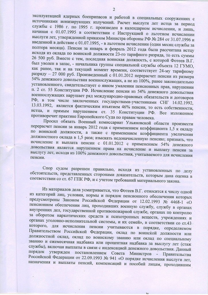 #857Выплата январской пенсии в конце декабря была, на сколько я помню, без 1,5. А это значит, что была приостановка действия старого Указа 2000г. С февраля 2012г, после опубликования 1745- его применили и пересчитали пенсии с 01.01.2012г с коэф.1,25. Попробуй тут подкопайся.(можно, конечно заявить, что старый указ незаконно приостановили, но что это даст? Ведь пересчет все- таки провели. Положем, выплатили бы в январе 1,5. Потом в феврале срезали бы 0,25 и отобрали то что выдали в январе. Стало бы легче? Хотя, может быть что-то тут и есть, выданную пенсию отнять не могут... Может быть кто-то разовьет мысль?) Я и сам до отзыва СпецЯОКУ из ВС витал с радужной надеждой на то, что кассация на мое исковое именно по этому пункту пройдет, но, к сожалению, не судьба, хотя жалоба подана и находиться на рассмотрении. Повторюсь- самый негативный факт для нас то, что Указ 1745 связан с новыми законами о повышении. Если бы он сам по себе был, январь мы бы отстояли, а так, в преамбуле сказано - в связи с принятием 308 и т.д..Владимир Геннадьевич, как же " ..его и не применяли до 31.01.2012г." Не понял Вас . Разве выплата январской пенсии в конце декабря без полуторного к-та к должностному окладу или с к-том 1,25 (по утветждению ecaul32 ) не является свидетельством того, что указ № 1745 был применен, причем до официального опубликования?