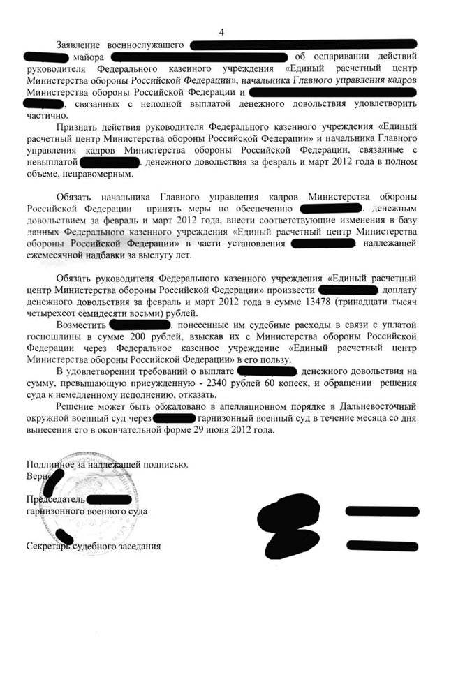 Вот это я понимаю!!! Коротко и по делу!)"Обязать руководителя Федерального казённого учреждения «Единый расчётный центр Министерства обороны Российской Федерации» выплатить Логвинову С.Л. удержанную часть его денежного довольствия за май 2012 года, в размере выплаченной ему в январе-апреле 2012 года премии за добросовестное и эффективное исполнение должностных обязанностей (<данные изъяты>"