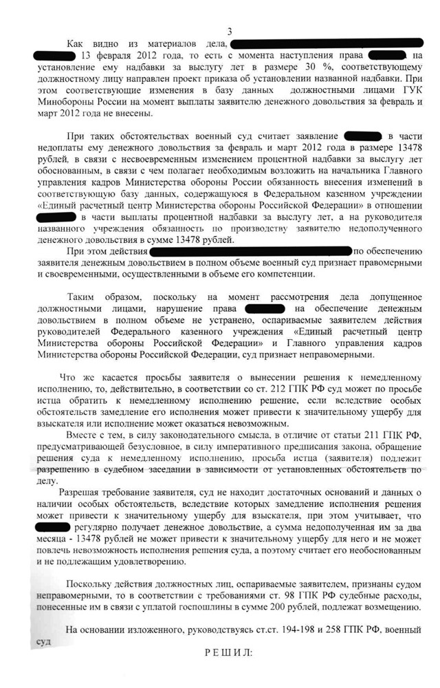 Форму заявления взяла с "Денежное довольствие в распоряжении" пост 19833, но включила в него фразу из Вашего заявления: "Взыскать с ФКУ ЕРЦ МО РФ в мою пользу недоплаченное мне ДД за ..., ... в сумме... ". 23 июля подала, на 27 июля назначили заседание - сегодня судья перенес на 31 июля в связи с тем, что от ЕРЦ не поступило ответа. Сказал, что если ничего не будет, то выносим решение по выплате. Но почему-то его не устраивают в моем заявлении два момента: вышеприведенная фраза, а именно "взыскать" он предлагает заменить на "обязать выплатить" и второй: "Согласно статьям 211 и 212 ГПК РФ вынести решение к немедленному исполнению". Объясняет тем, что данные моменты применимы к заработной плате, но не к денежному довольствию. Предлагает "откорректировать". Ваше заявление нормально прошло? Правомерны ли данные замечания?собрал "выжимку" избранного с форума и влепил в заявление