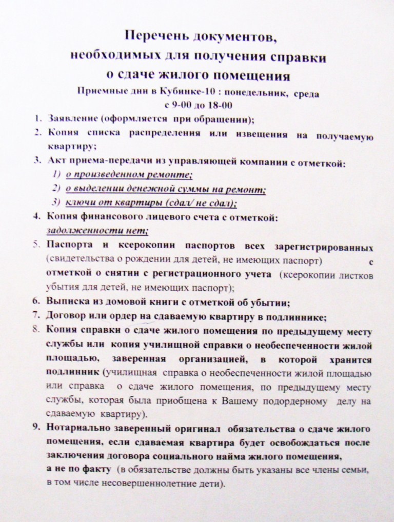 Уважаемые форумчане! Подскажите пожалуйста какие документы необходимо собрать для получения справки о сдаче жилья, или где можно посмотреть. Живу в общаге, прописан при части. С уважением