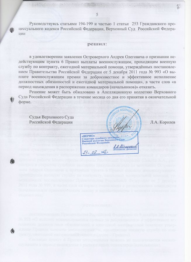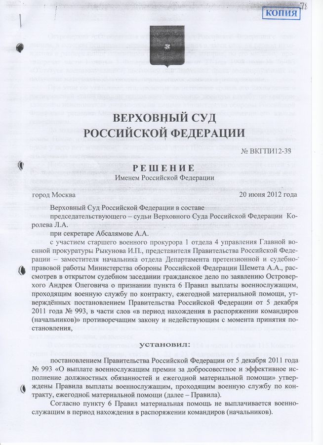 19 марта 2012 года я вновь обратился с рапортом о выплате мне материальной помощи за 2012 год, но на основании Постановления Правительства Российской Федерации от 5 декабря 2011 г. N 993 г. Москва "О выплате военнослужащим премии за добросовестное и эффективное исполнение должностных обязанностей и ежегодной материальной помощи" мне был дан письменный отказ №293 от 19 марта 2012 года со ссылкой на то что материальная помощь не выплачивается военнослужащим в период нахождения в распоряжении. То есть чиновники Министерства обороны Российской Федерации меня по настоящее время (больше двух лет) считают военнослужащим проходящим военную службу в распоряжении.