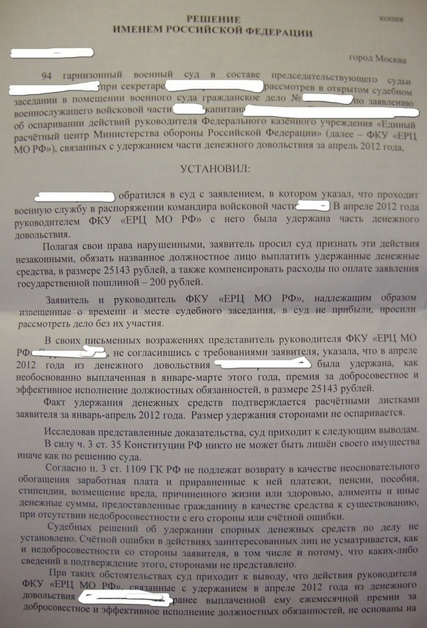 решение Солнечногорского ГВС тут - Решения по денежному довольствию заштатников