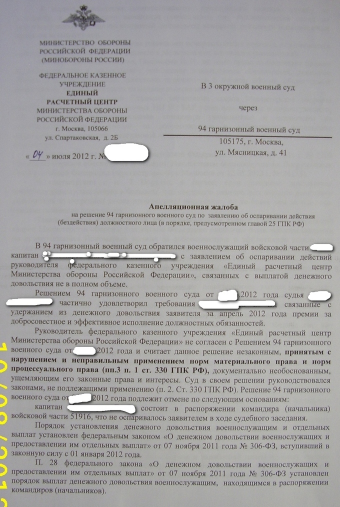 Сегодня получил апелляционную жалобу на решение суда по неполному денежному довольствию. Выкладываю на общее обозрение.