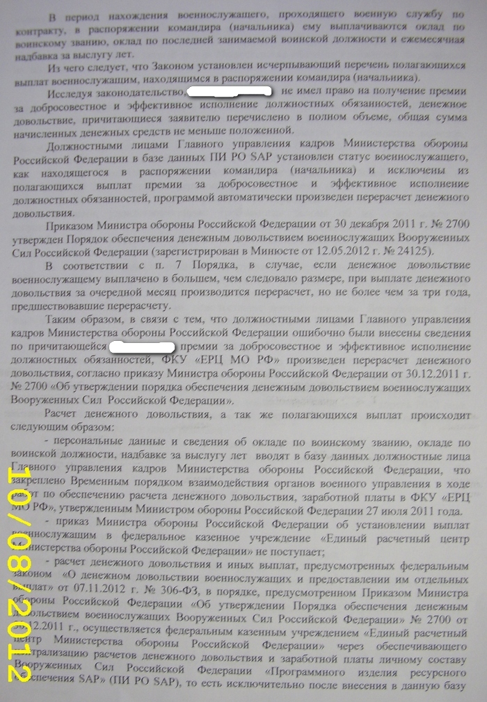 Не может быть принята во внимание и ссылка представителя финансового органа на ошибку, допущенную кадровым органом Минобороны России и повлекшую за собой выплаты Тарану необоснованных премий, поскольку в соответствии с Положением о ЕРЦ МО РФ обязанность по своевременному начислению и обеспечению личного состава денежным довольствием и другими выплатами, возложена именно на данный финансовый орган.