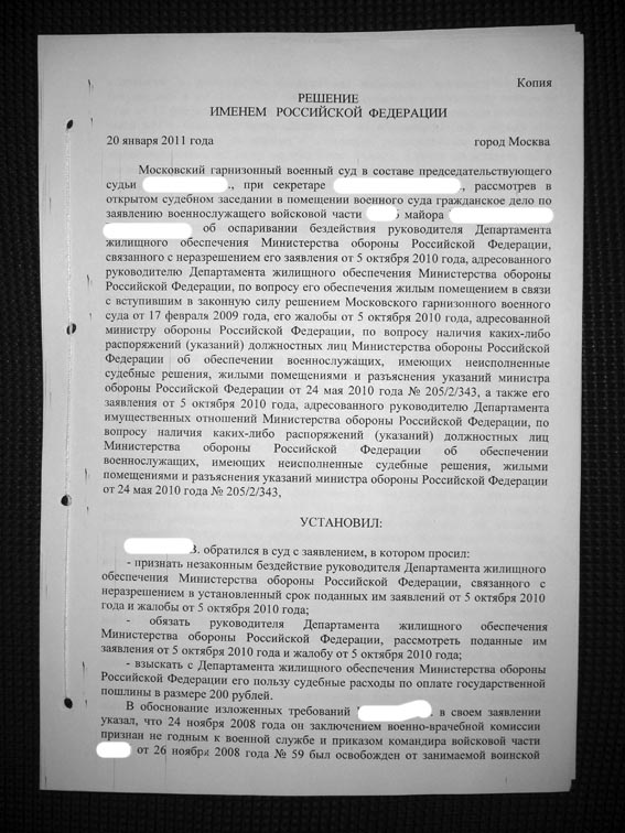 Оставалась призрачная надежда решить эту проблему через суд. Вовремя попалась на глаза заметка в "Российской газете" о том, что для выбивания жилья надо привлекать "своего министра". Для этого надо было каким-то образом выстроить "цепочку" ответчиков, что я и сделал - лично обратился к "ближним" командирам (при беседах, а через полгода - рапортом), ГК ВВС и к МО РФ. Рапорт реализован не был, на первые обращения к ГК ВВС и МО РФ ответы я не получил, а на вторые получил отказ со ссылками на устаревшие НПА. Вот и появился формальный повод для привлечения всей "цепочки".