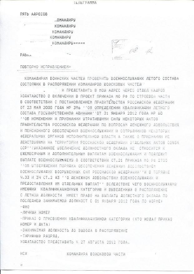 Если можно эту телеграмму скинуть в личку на alexx0665@mail.ru желательно если с исходящим и датой, от кого. Очень необходимо для апелляционного суда так как первый проиграл отказали. Заранее очень благодарен.К нам в часть пришла тлг.на включение распоряженцев в установочный приказ МО на выплату за класс, но кадры все делают что бы затормозить этот процесс.