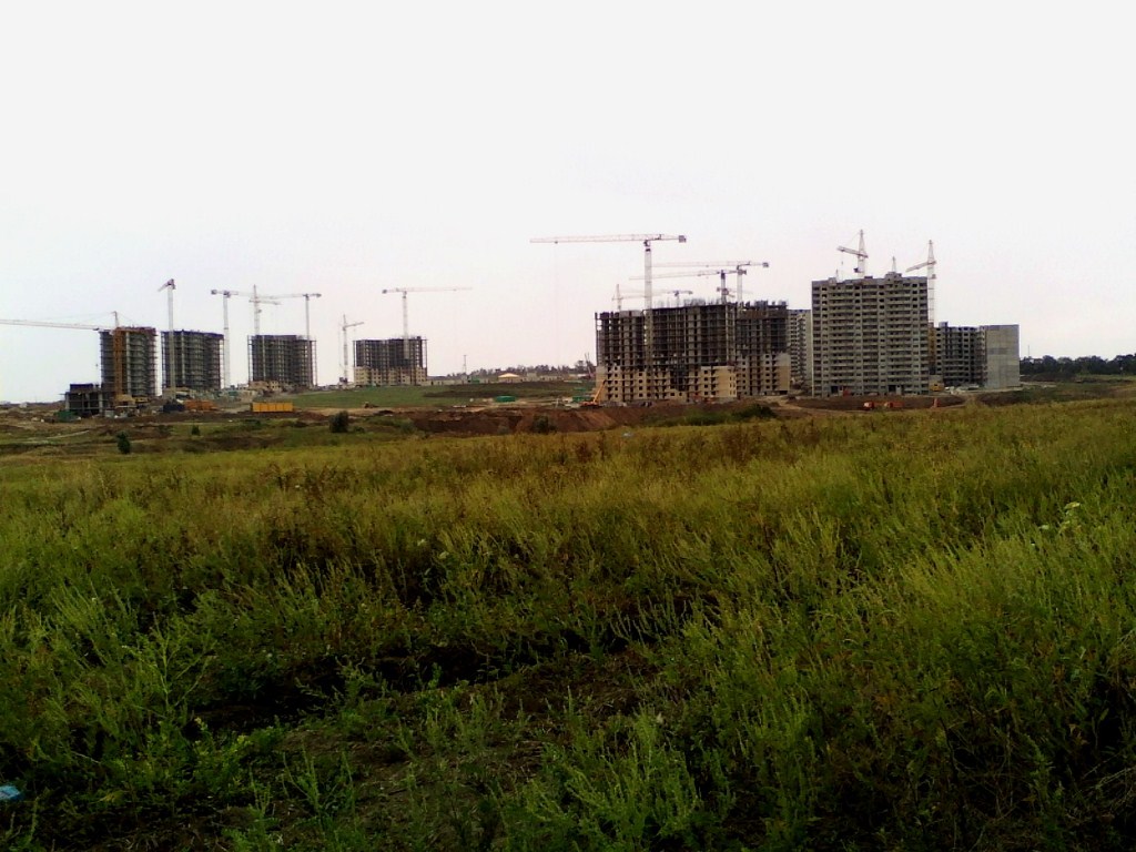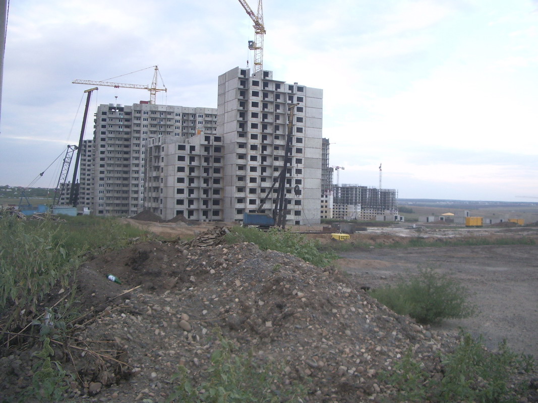 Сложилось впечатление, что строительство городка идёт не слишком-то и быстро (краны неподвижные, людей не видно). Правда несколько машин-бетономешалок и панелевозов встретилось.