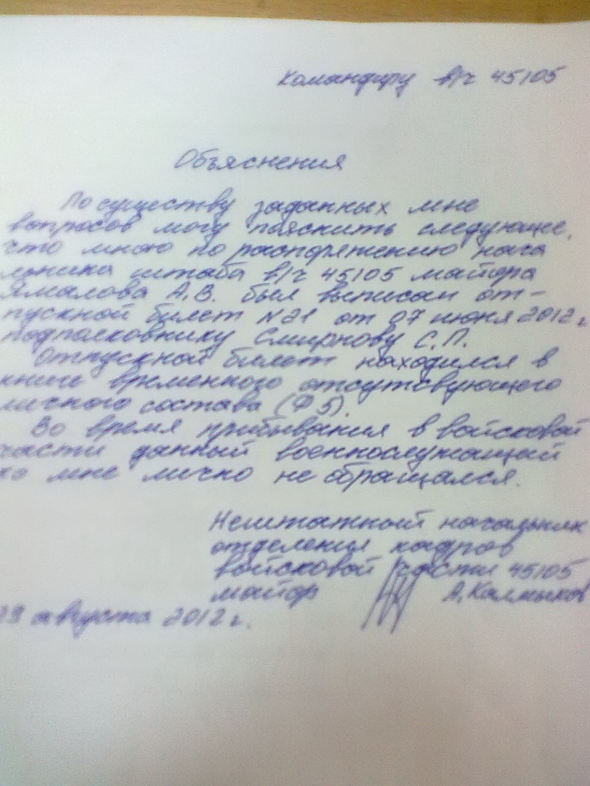 Также доводы заявителя в части отсутствия приказа должностного лица о предоставлении ему отпуска подтверждаются исследованными в суде справкой войсковой части №, выпиской из приказа МО РФ № 1459 от 14 июня 2012 года, поступившей в войсковую часть №, согласно записей в книге учета входящих документов, 6 августа 2012 года, и проектом данного приказа, направленного из войсковой части № на подпись Министру обороны РФ в апреле 2012 года, в которых указаний о предоставлении Смирнову С.П. отпуска, месте его проведения не имеется.