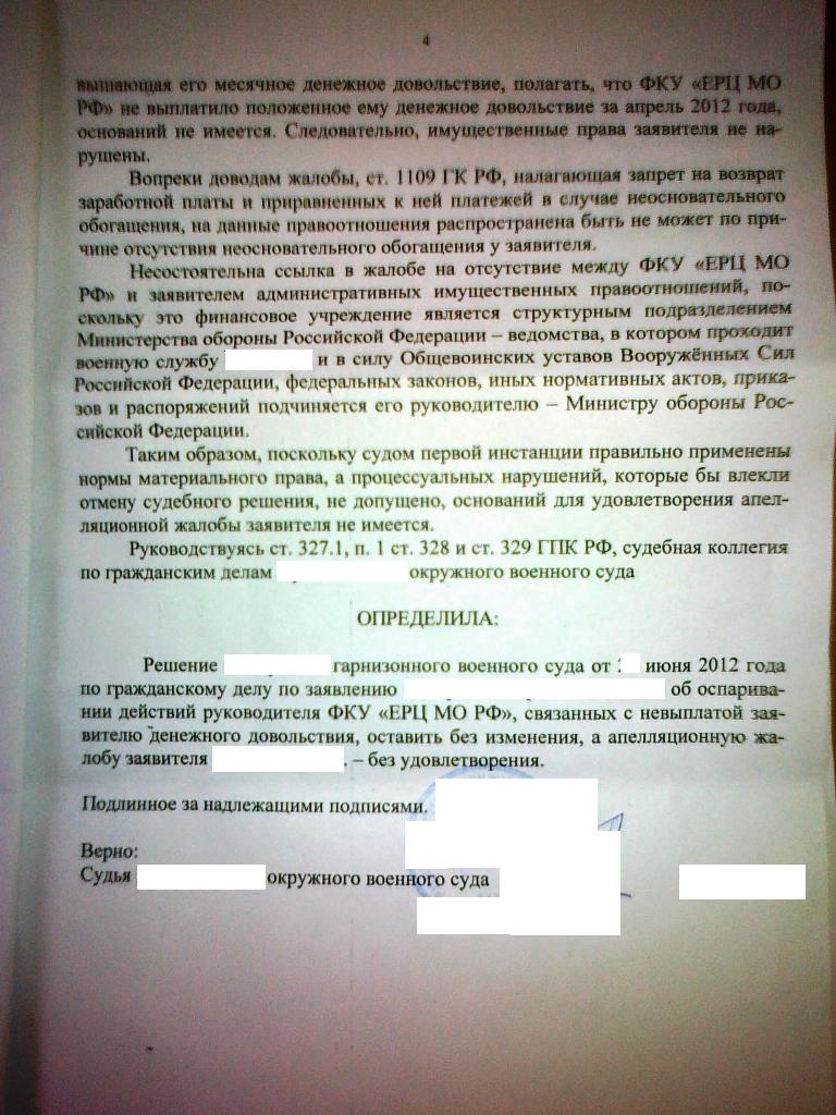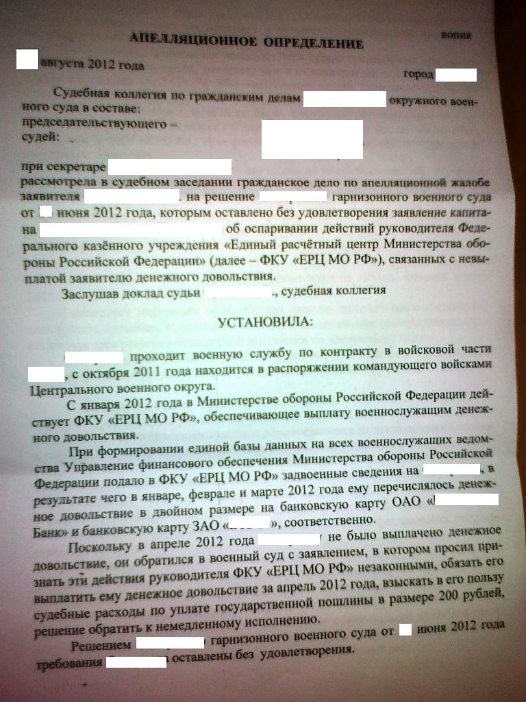 Спасибо форуму за помощь в составлении заявления по факту удержания с моего денежного довольствия за июнь 2012 г., "незаконно" переплаченных мне денежных средств с февраля по май 2012 г.Сегодня состоялось заседание. У судьи вопросов не возникло,сразу сказал решение в мою пользу. Ожидаю решение по почте.
