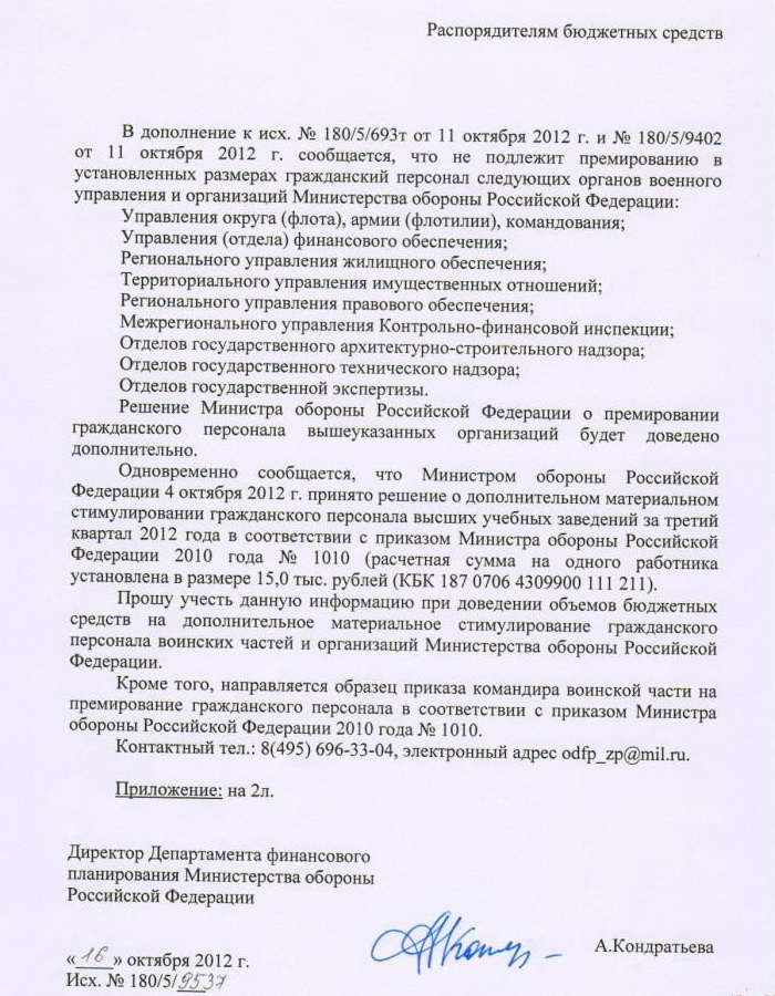 #735[quote="maxxx1979"]Указания директора Департамента финансового планирования Министерства обороны Российской Федерации по материальному стимулированию гражданского персонала в 3 квартале 2012
