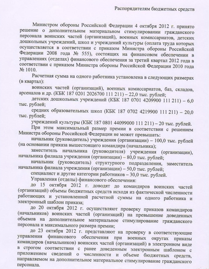 по материальному стимулированию гражданского персонала в 3 квартале 2012 г. органов военного управления- как будет указание-Выложите-Спасибо!