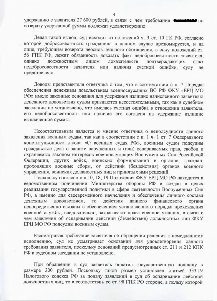 Что у вас за суд , если не секрет, и дата вынесения решенияНа руках положительное решение суда об удержании премии за добр. исп.обяз.В решении указано возложить на руководителя ЕРЦ МО РФ обязанность, с учетом выплаченной суммы обеспечить меня денежным довольствием за май 2012 г.в полном обьеме, предусмотренном для в/с проходящих службу в распоряжении.