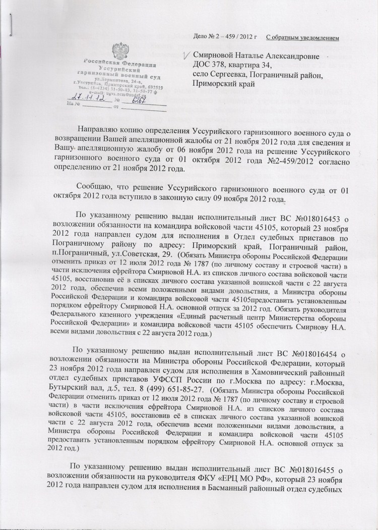 Суд правильный...к судьям Уссурийского ГВС у меня, лично претензий нет....это если суд правильный и вынес правильное решение.