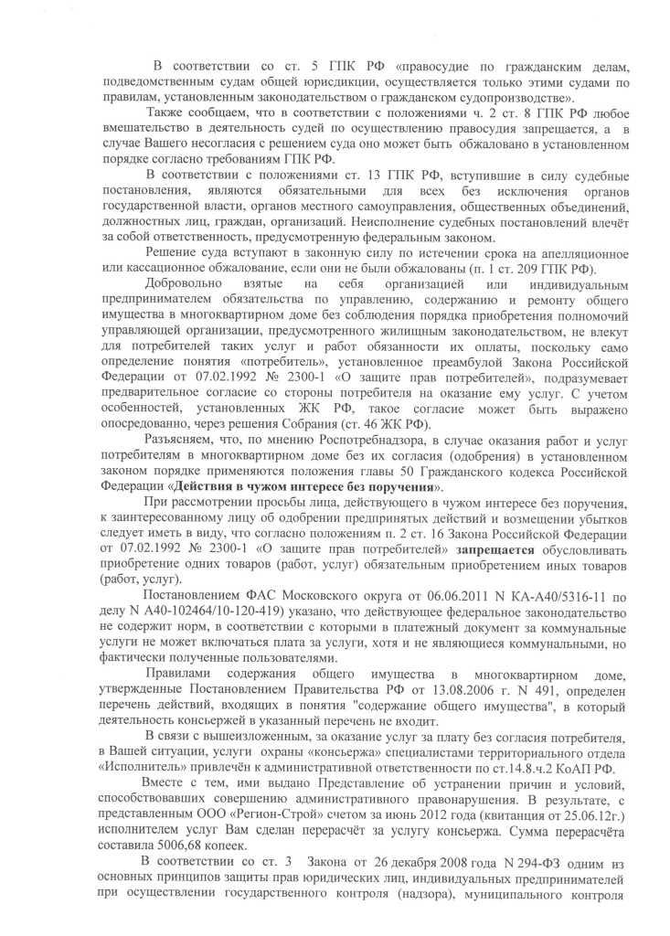Коллеги, я смотрю, ответ из Роспотребнадзора скачан 38 раз, а решения судов различных инстанций - всего один раз. Самое интересное - в решениях судов. Я их не стал выкладывать отдельно, а засунул в архив, потому что очень высокое разрешение файлов, очень большого объема графика.Коллеги, прошу обсудить ответ из Управления Роспотребнадзора по Московской области касательно навязывания доп. услуг. В первую очередь интересует Ваше мнение по поводу витиеватых формулировок на счет ДОМОФОНА. Также прилагаю в виде архива упомянутые в ответе решения судов. Я так понимаю, жулики от ЖКХ все-таки нашли лазейку в законах и за ДОМОФОН отдельной строкой платить - ЗАКОННО?