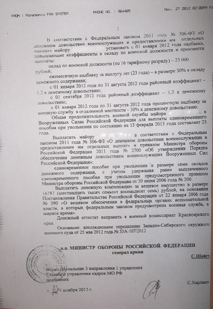 Не, все было не так. 28 ноября я получил письмо от КЧ с 4 мя отпускными билетами( по 2 отпуска за 2012 и 2013 года), и в этот же день, 28 ноября, в Красноярском ГВС меня ознакомили с выписками из приказов МО, которые я выложил. Даты в отпускных с датами в приказе МО совпадают.Думаю надо к командиру сходить. Пусть ознакамливает с приказами о направлении в отпуск, выдаёт отпускной билет – всё как положено. Зафиксировать всё это дело рапортами. Три месяца на обжалование есть, так что можно спокойно ехать в отпуск, и готовить новую телегу. А месяца через 2 с половиной – снова в суд по исключению. А если в отпуске заняться нечем - то не мешало бы ЕПУ отить.