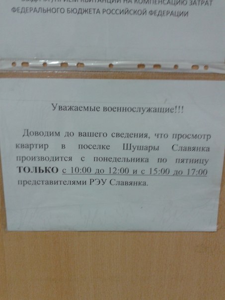 #3866Вот нашла в контакте режим работы 119 кабинета и информацию по осмотру квартир в Славянке. Ну все для людей, режим работы с 10-13 вообще убивает, мало того, что извещение не отправили в Североморск, так еще и успей его получить до 15.12 (выписано 15.11)с таким режимом работы как хочешь, а на сайте 800 с лишним фамилий, кому получить их нужно. Сегодня люди не успели получить извещения, записались на завтра, т.е. еще и ночевку искать надо.