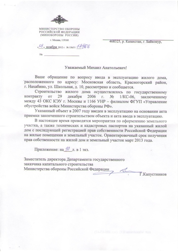 Приложение - это акт приёмки и акт ввода в эксплуатацию.Скиньте ответ от Замдиректора ДГЗКС МО РФ Г.Капустникова