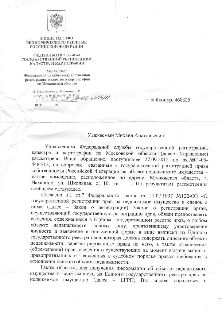 У вас в ответе указано право собственности РФ на квартиру? Давайте соберем данные ответы и приложим в обращении.Ответ получил письменно примерно через две недели со всеми интересующими меня данными!