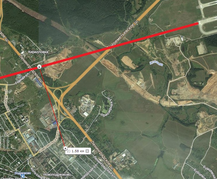 В отношении посадки самолета - бред! Лично был в Молжаниново, стоял на перекрестке ул Синявинской и Комсомольской. Еле расслышал звук приземляющегося самолета. Дальность посадочной трассы (глиссады или как она там правильно называется) от перекрестка примерно 500-700 метров. А может и немного более.