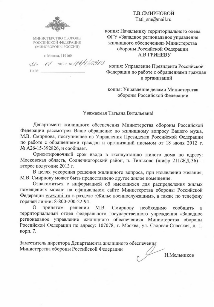 Последние новости от тимоновских чиновников в погонах: дом, действительно, сделают служебным. Нас, таких упертых и несговорчивых, осталось 35 человек на 38 квартир. Что с нами делать, они пока не знают. Предлагают квартиры в Истре, Чехове, Серпухове, Апрелевке. Хотя мне за 2,5 года никто нигде ничего не предлагал! Возможно, один подъезд в доме сделают неслужебным. Так они хотят, но это если получится! Появились слухи о том, что в Солнечногорске будут строить малоквартирные дома (2-3 этажные) для военных пенсионеров. Но где именно в Солнечногорске и когда - тоже не известно. Вот пока все.