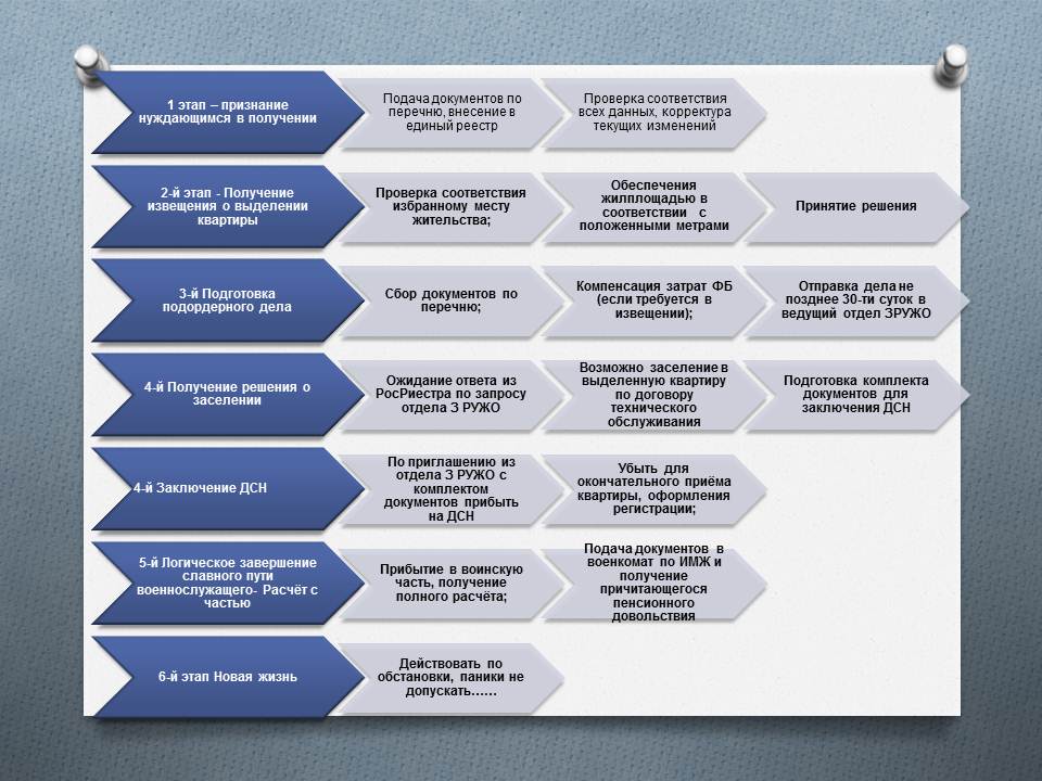 Основные мероприятия, которые необходимо выполнить военнослужащему для реализации своего права на постоянное жилое помещение от Минобороны при избрании формы обеспечения - получение квартиры по избранному месту жительства.
