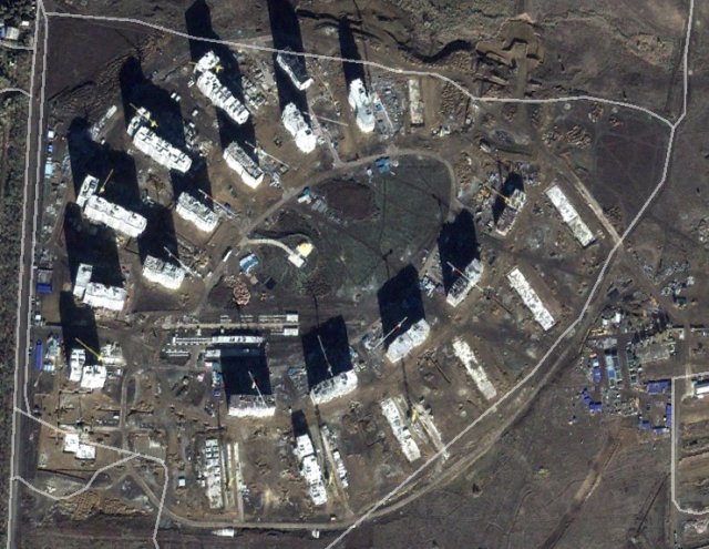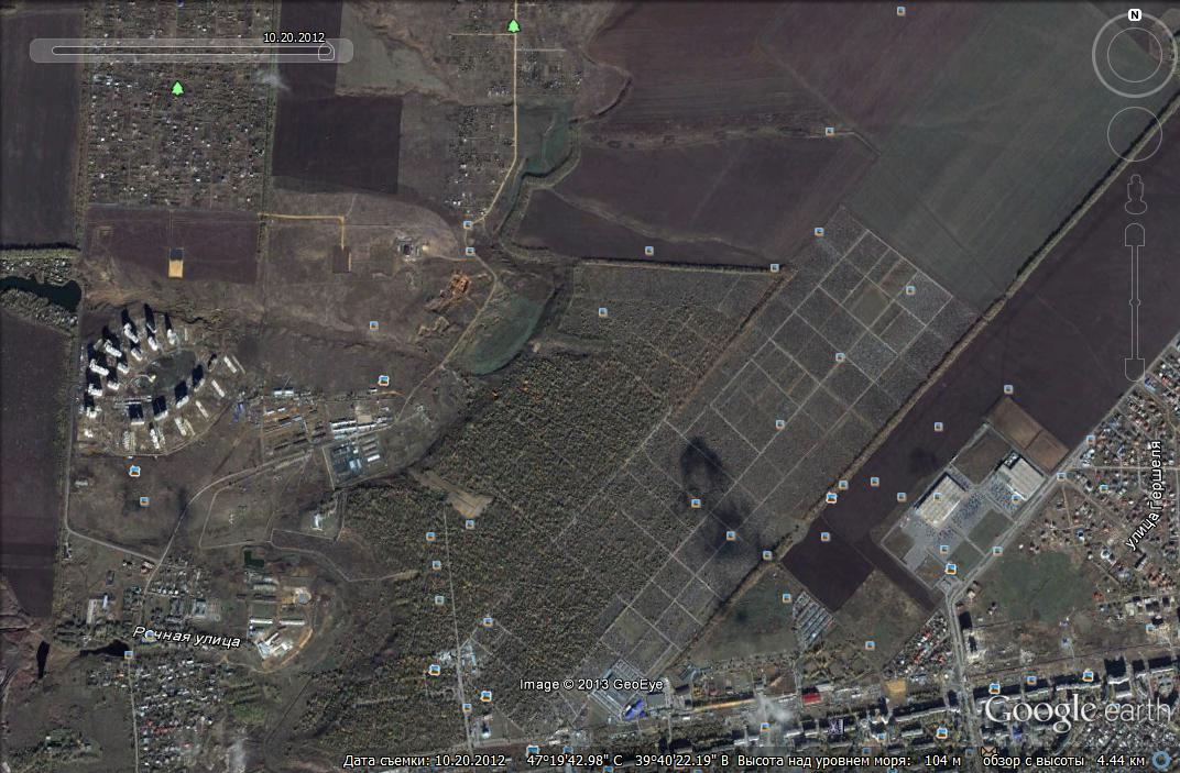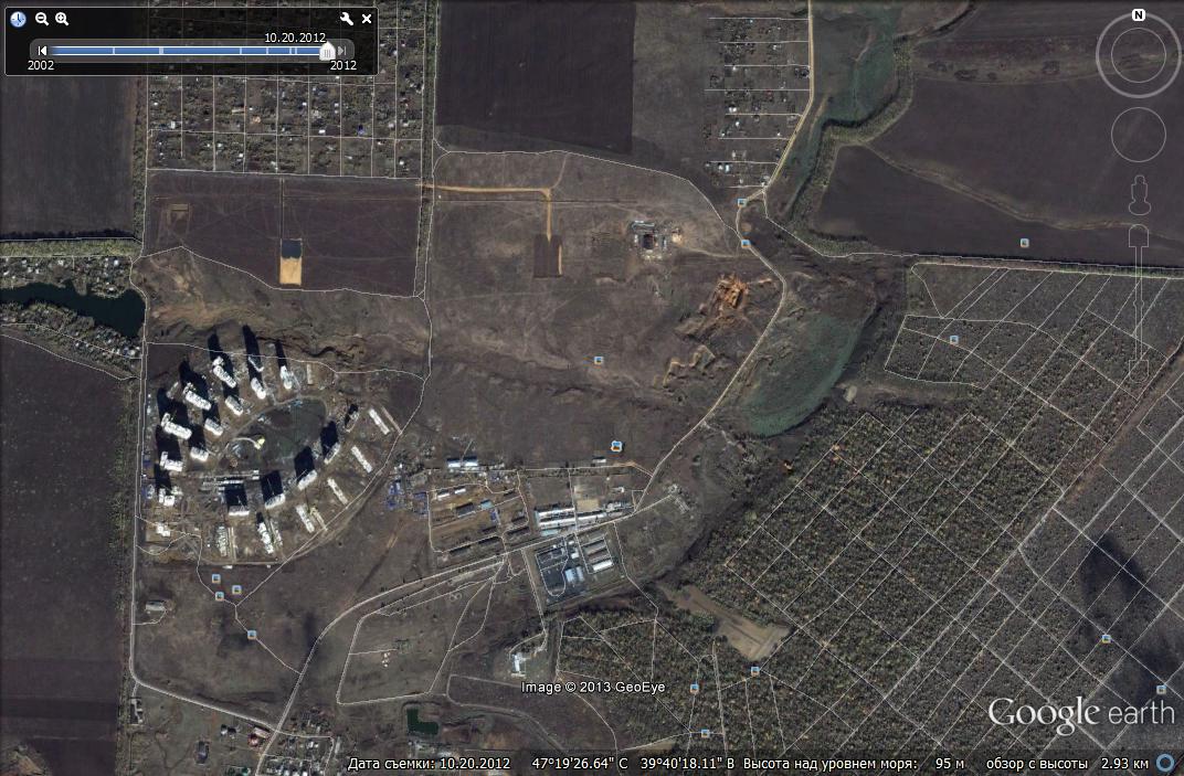 4. Но так как Гугл "копит" фото местности для последующего полного обновления региона проверяем наличие в данном квадрате свежего снимка будущей обновленной местности, нажимаем на панели инструментов на иконку в виде будильника с зеленой стрелкой сверху "Исторические снимки", гоним бегунок на конец 2012 года - на дате 20 октября 2012 появляется последнее фото стройки городка