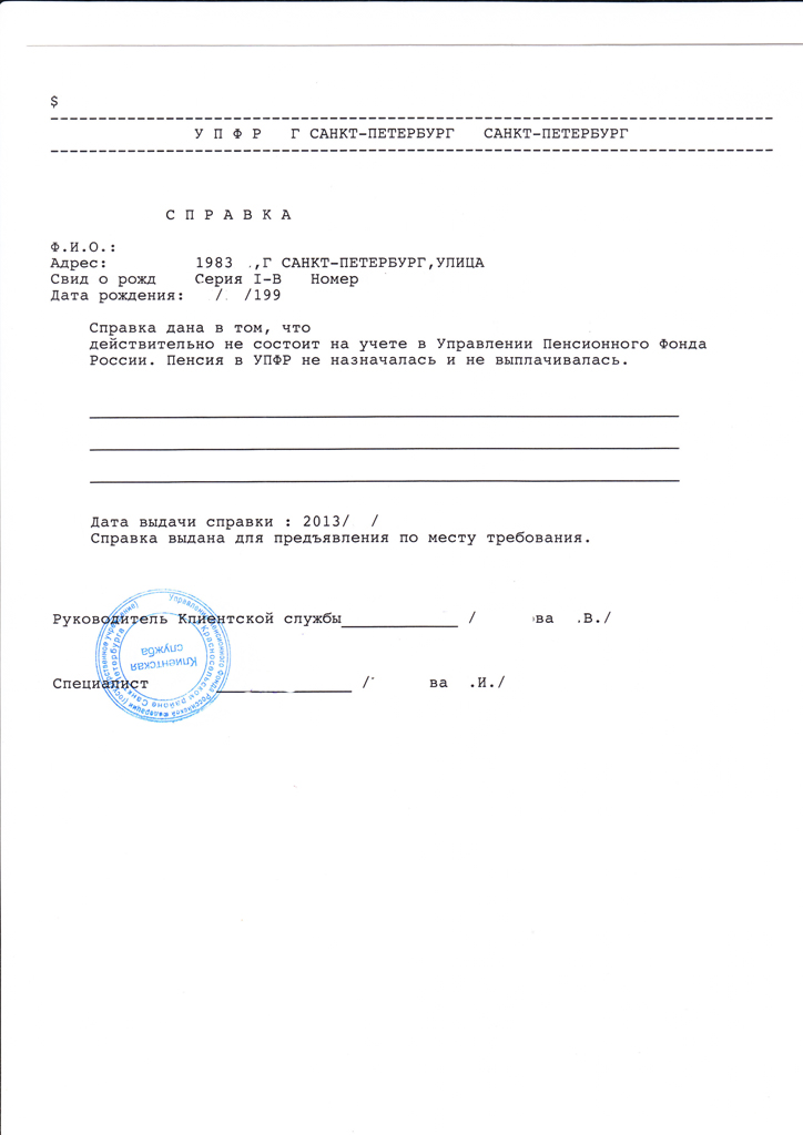 5. Справки (3 шт.) из УПФР г. ХХХХХХХХХХХ на себя, жену и сына(получаете в отделении пенсионнного фонда своего района);