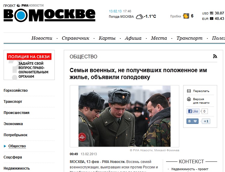 13 февраля Наталья Золикова, жена офицера в отставке Константина Маркина, мать четверых детей, объявила бессрочную голодовку. Женщина пытается добиться от Минобороны положенную по закону квартиру в Москве. Новгородские власти о демарше Натальи Золиковой в курсе, однако, помочь ей не могут.