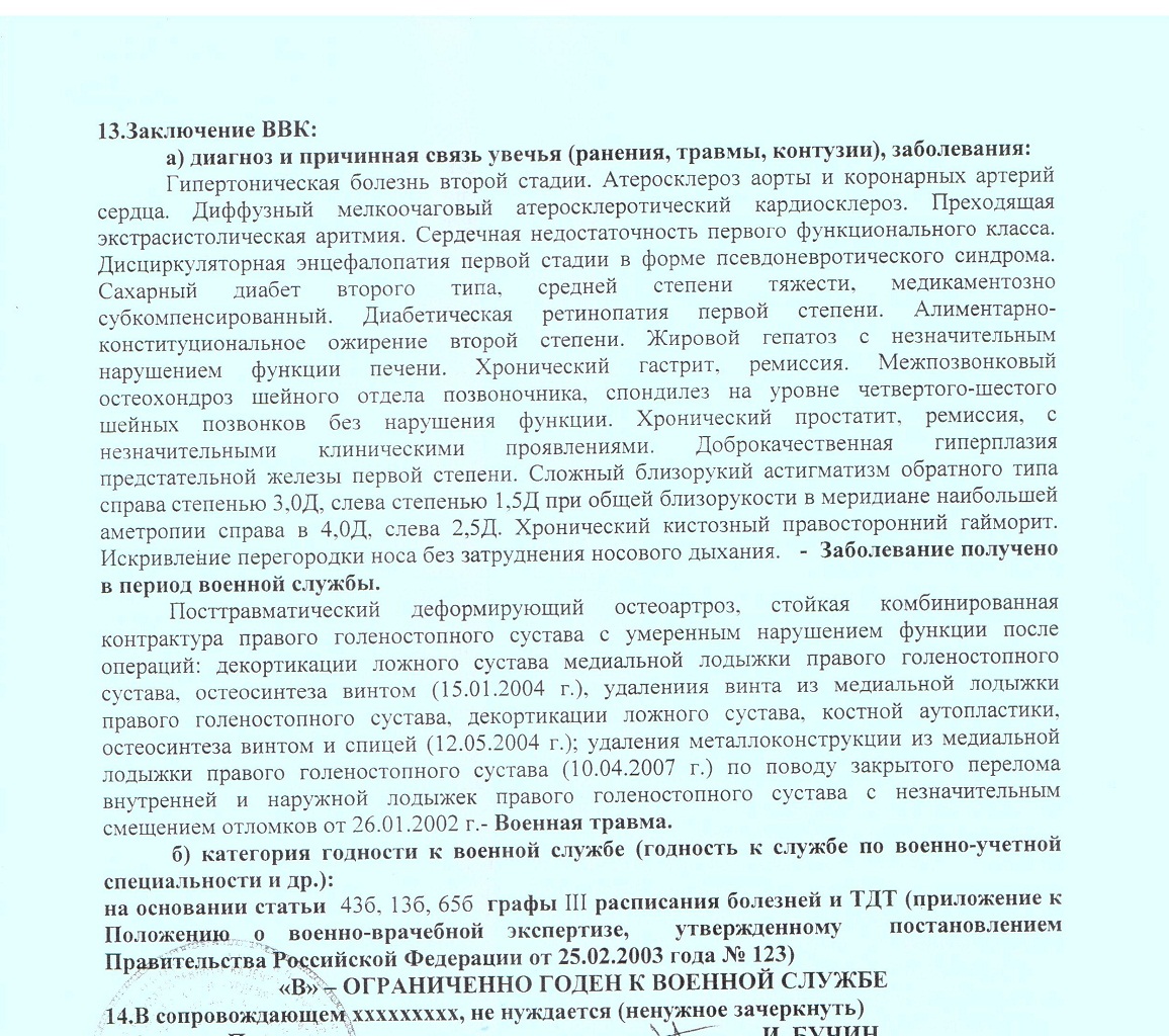 ... были ВВК, послед 12.2011 г. - не годен, 07.2012 г. - 3 гр. инвалидности, заб-е получено во время службы