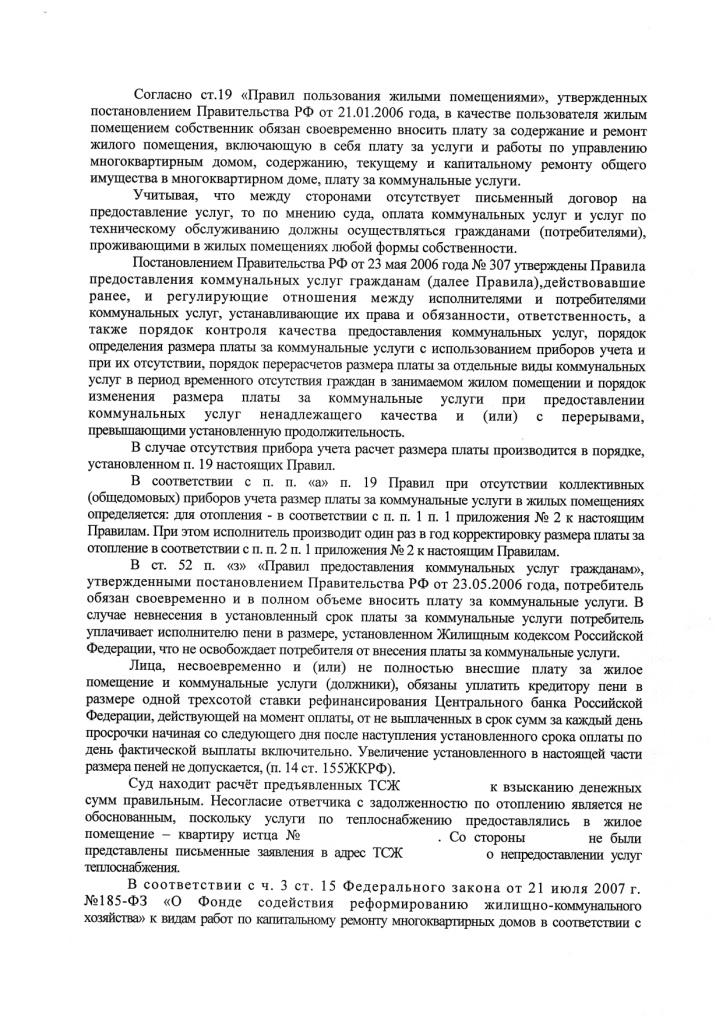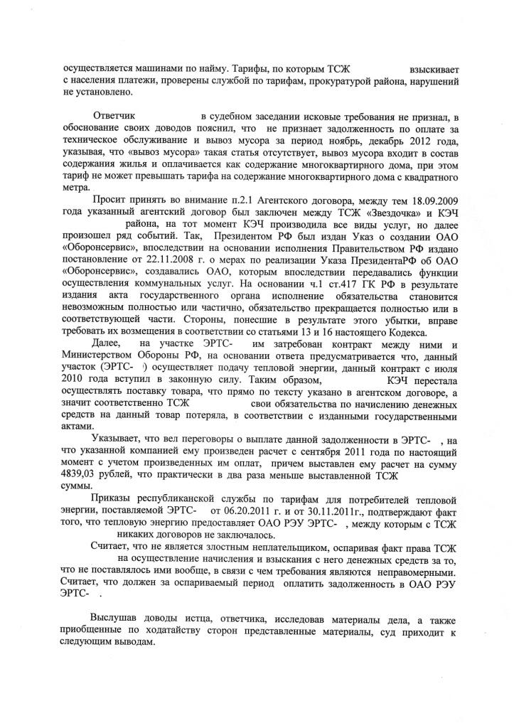 Решение получу 28 февраля, оплату произвожу ресурсоснабжающей то есть РЭУ, но созданный участок РЭУ оказался бунтовщиком и вышел из-под контроля бывших КЭЧевцев, а отопление в Сибири денежки немалые. Желудок у бывших КЭЧевцев на денежные средства довольно растянутый, а тут их простые вояки которые составили костяк энергетического участка подрезали, деньги жителям начисляют по действующим НПА, да еще и перерасчет делают без боя, практически автоматом. Вот и начали на нас подавать в мировой суд, пытаясь вырвать деньги за спорный период. ТСЖ пользуясь старым агенским договором подает иски в основном за летние месяцы, так как РЭУ начисляет и принимает денежные средства только за отопительный период. А еще этим же решением суд обязывает выплатить за неутвержденные ОМСУ, но повышенные тарифы для нанимателей на услуги по содержанию и ввело дополнительную услугу по сбору и вывозу ТБО повысив тариф сразу с 3 рублей до 85. Вот за это и боролись. Но все законно, по мнению суда. Как может быть не законно если перед этим уже пару сотен пенсионеров окучили по этому же принципу. Правда старые пенсы приходили в суд только с квитанциями, а мы с чемоданом документов, но увы только бумагу потратили. Унынья нет впереди аппеляция, если так не прорвемся, то будем пытаться через идущую "волну" борьбы с жуликами в ЖКХ. Да договора с ТСЖ нет вообще ни на какие услуги, да и не хотят они его заключать, а то после заключения особенно одаренные начнут требовать выполнения.