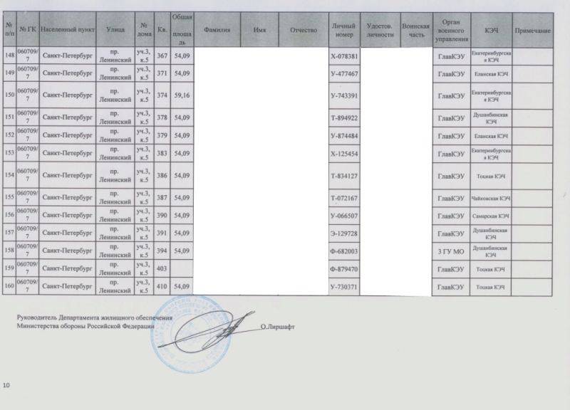 с Ленинским проспектом в С-Пб история немного другая - те квартиры были распределены в 2009-2010 г.г. ещё по 80-му приказу, когда реестра ещё в помине не было, и Лиршафт подписывала приведенные Вами списки скорее для проформы, когда у перечисленных военных были на руках документы, подписанные еще в 2009-2010 всеми инстанциями вплоть до Москвы (ГлавКЭУ и т.п.)...
