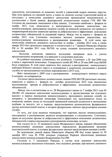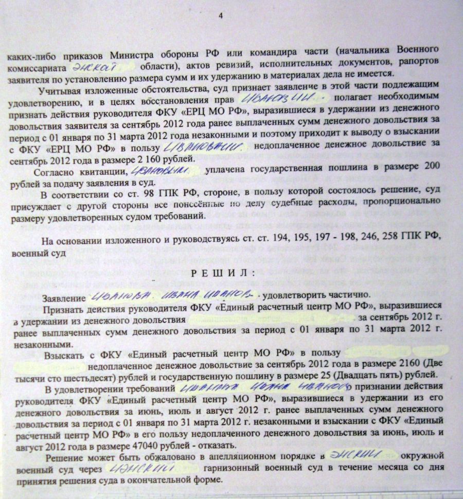#1410про трудовой кодекс зря указывали в заявлении, он на военных не распространяется, а как раз самое основное на мой взгляд не указали, надо было бы изложить как то так В соответствии с ч. 3 ст. 35 Конституции Российской Федерации никто не может быть лишен своего имущества иначе как по решению суда, а частью 2 ст. 130 Гражданского кодекса Российской Федерации деньги отнесены к движимому имуществу, следовательно, удержание из денежного довольствия при отсутствии соответствующего решения суда или моего волеизъявления на это, является недопустимымДобавлено спустя 2 минуты 19 секунд:crystallsks,