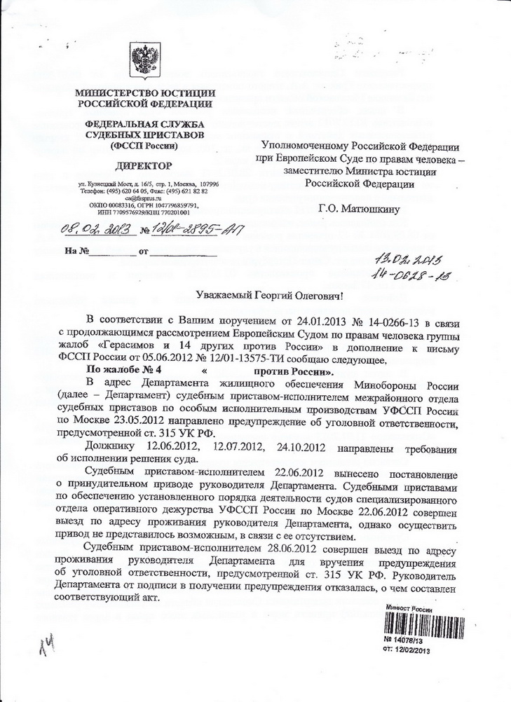 Друзья, прилагаю копию ответа директора ФССП от 08.02.2013 г. (часть данных мной обезличена и "обезнумерована"), из которых следует что, на квартиры МО на Варшавке и Янгеля с 10.12.2012 г. действует запрет на совершение регистрационных действий. Возможно информация будет полезной.