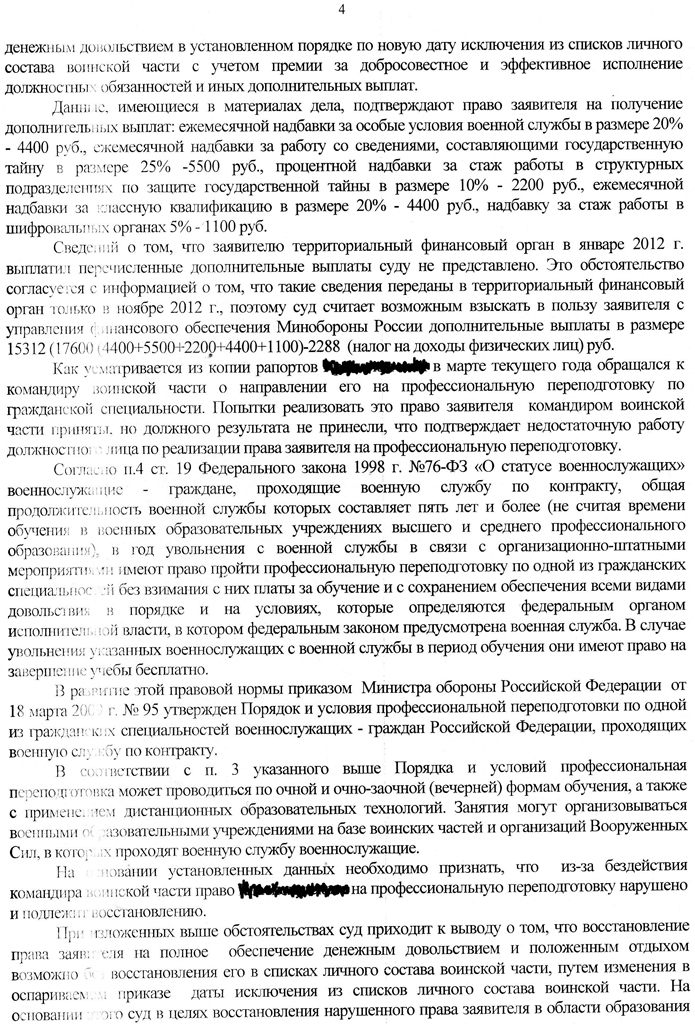 Также суд обязал командира войсковой части № обеспечить прохождение К. профессиональной переподготовки по гражданской специальности без взимания с него платы за обучение и взыскал с управления финансового обеспечения в пользу заявителя дополнительные выплаты за ДД.ММ.ГГГГ в сумме <данные изъяты>.