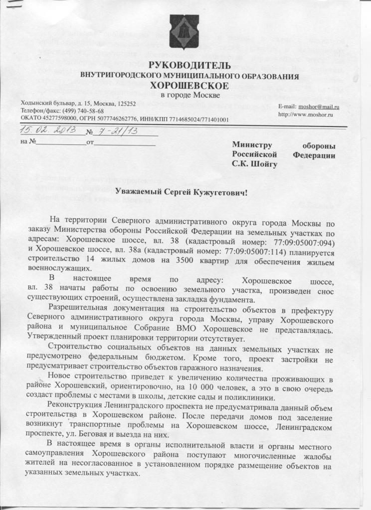 Просто еще немного информации про стройку. Письмо руководителя муниципального образования Хорошевское Министру обороны: