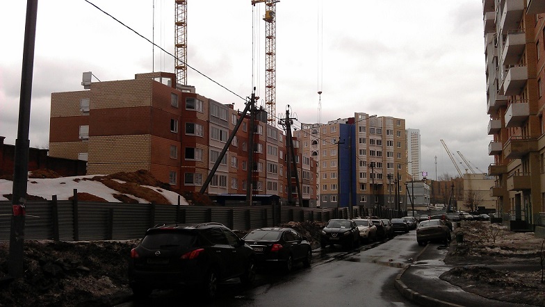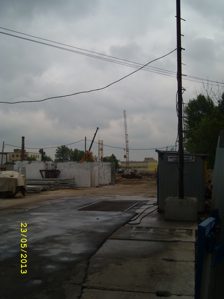 Суббота. Строительство идет полным ходом. Краны работают, плиты подвозят, грязь, слякоть, рабочие в 12 дня уже в "хорошем состоянии" бегают за добавкой в магазин.