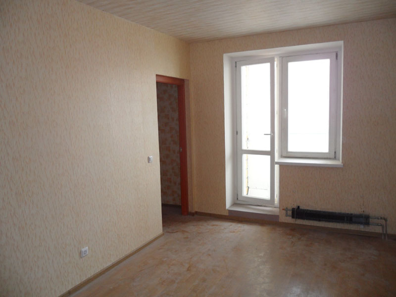 Большая комната (виды от двери и от окна) На полу - линолеум, на потолке - обои. Расцветки обоев в комнатах и квартирах могут не сочетаться никак (обошлись без дизайнера