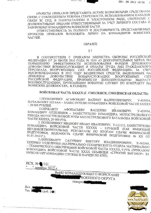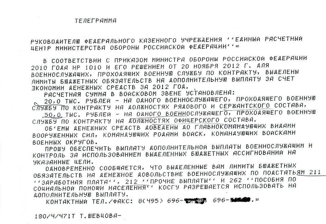 Указания директора Департамента финансового планирования Министерства обороны Российской Федерации по 1010 военнослужащим в 2012 г.