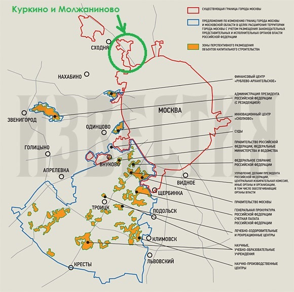 #4268Ну здесь Вы не совсем правы. Смотрим границы Москвы и видим аппендикс перед Зеленоградом - это и есть Куркино и Молжаниново. Но договариваться властям по-любому придется, так как по границе районов проходит железная дорога и Молжаниново окружено Московской областью. Хотя при желании железная дорога - не помеха.Радистка51, Куркино находится в СЗАО Москвы, юго-западнее Молжаниново. А главное, они никак не граничат. Между ними Планерная и Новоподрезково. Когда я пишу, что вокруг Молжаниново находится Московская область, я хочу обратить внимание на то, что подключение к техническим сетям можно произвести только к объектам в другом субъекте РФ. Либо Минобороны, либо власти Москвы должны договориться с властями или организациями Московской области. И здесь могут быть проблемы.