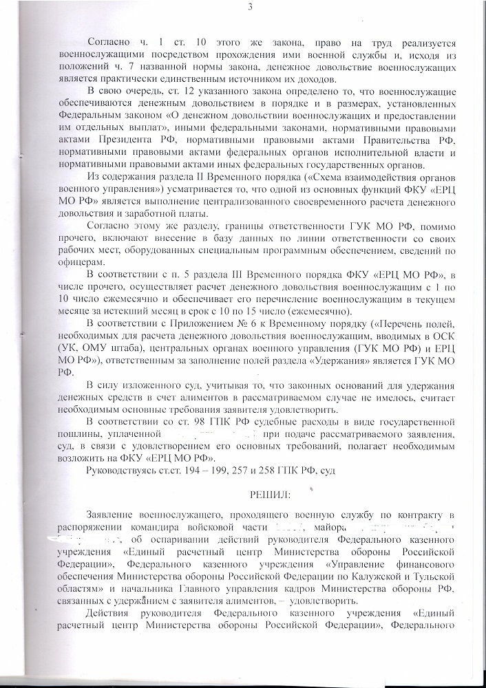 Тут надо смотреть суть самого дела - может ЕРЦ по инерции отнимало алименты, не имея от ФССП необходимых документов или удержание алиментов уже не предусматривается ввиду урегулирования процесса в другом порядке, например добровольное соглашение или как то по другому....Суть дела, с военнослужащего незаконно удерживали алименты. деньги за несколько удержанных месяцев вернули. и обязали в дальнейшем не удерживать