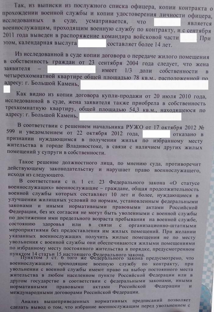 Выкладываю решение по моему коллеге. Обжаловал в 35 ГВС отказ ДЖО в принятии на учет, сейчас развелся с женой, ждет на одного себя жилье, восстановлен в списках части, так как не соглашался с увольнением до обеспечения жильем в ИПМЖ. С апелляцией ДЖО пропустило срок подачи. Показательно что у жены много жилплощади, правда зачем он ее подал как нуждающуюся вообще непонятно. Дополнительно в материалах дела было соглашение, что жена купила квартиру в ипотеку на собственные средства, в совместном владении и регистрации мужу отказала через суд, ипотека оформлена только на жену.