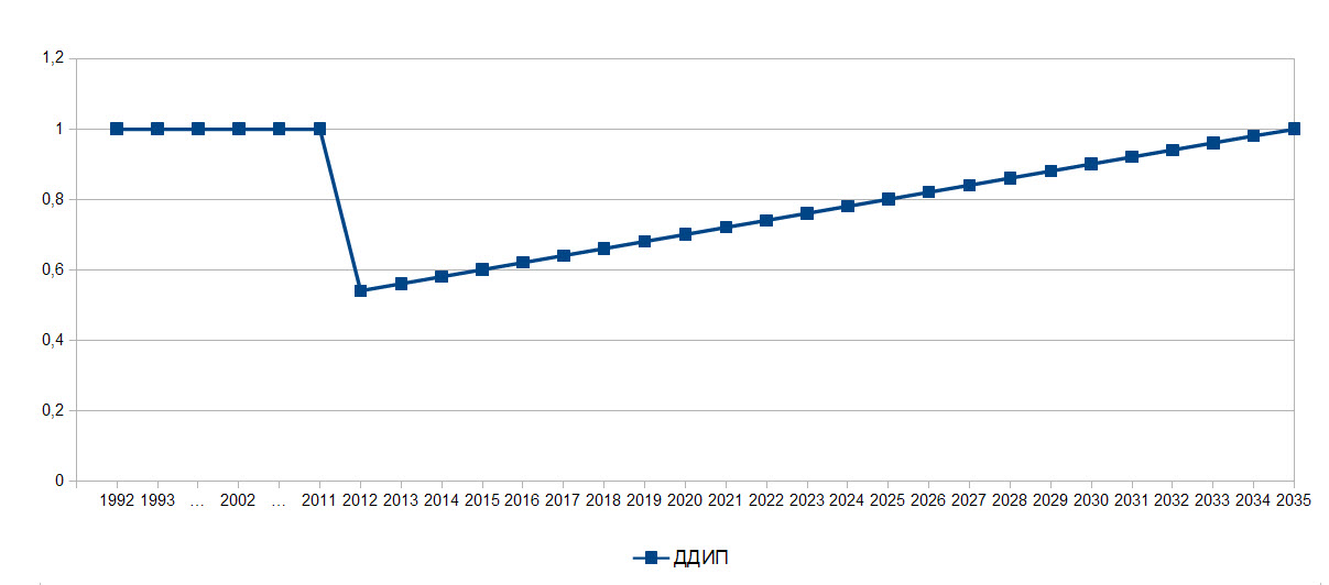 5. Этот коэффициент в 2012 будет равен 0,54, в 2013-не менее 0,56, в 2014-не менее 0,58 и так далее до 2035 года, в котором он достигнет 100%( если добавлять по 2% ровно каждый год) для всех кто на пенсии уже давно или только увольняется.