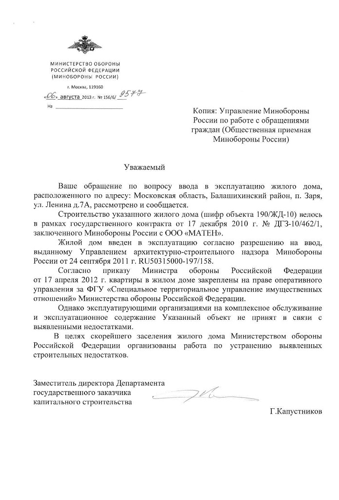 Д-а-а-а.... Расплывчатый, абстрактный и совершенно неясный ответ Минобороны. Нет конкретного ответа на поставленный вопрос. КАКИЕ СТРОИТЕЛЬНЫЕ НЕДОСТАТКИ ВЫЯВЛЕНЫ ЭКСПЛУТИРУЮЩИМИ ОРГАНИЗАЦИЯМИ? и КОГДА И В КАКИЕ СРОКИ БУДУТ ЭТИ СТРОИТЕЛЬНЫЕ НЕДОСТАТКИ УСТРАНЕНЫ? И СКОЛЬКО ВРЕМЕНИ ВСЕ-ТАКИ ВЫДЕЛЕНО НА УСТРАНЕНИЕ НЕДОСТАТКОВ? ВЛЮБОМ СЛУЧАЕ - ДОЛЖЕН БЫЛ БЫТЬ ЗАПЛАНИРОВАН ПРЕДПОЛАГАЕМЫЙ СРОК ВВЕДЕНИЯ В ЭКСПЛУАТАЦИЮ ДАННОГО ОБЪЕКТА.