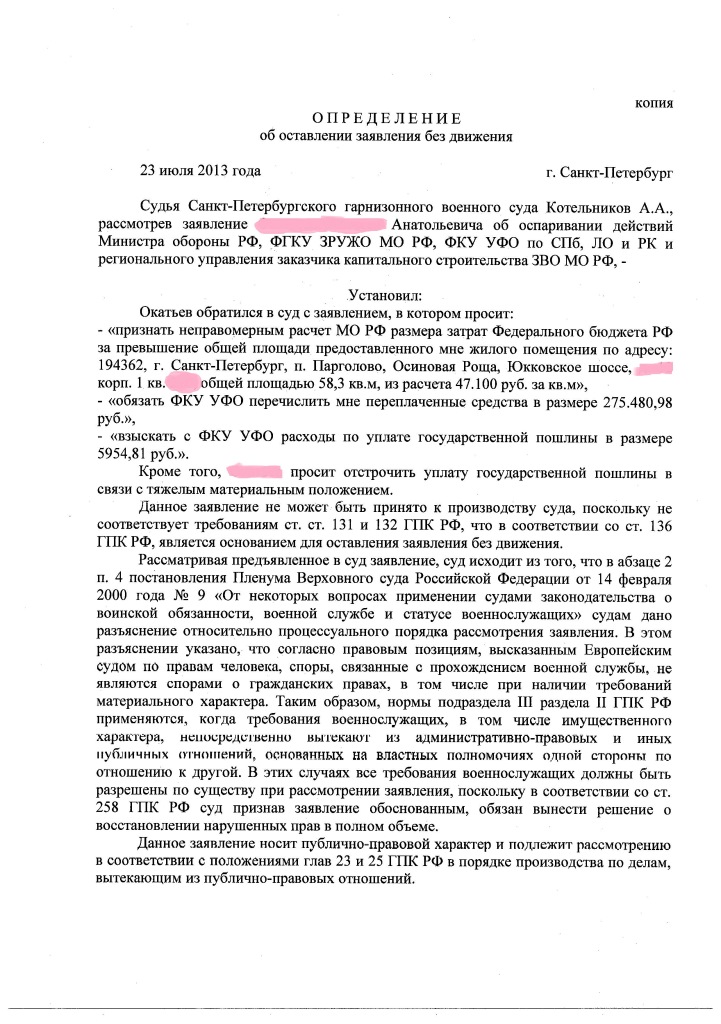 Это чистый иск, а не гл.25 ГПК, военный суд понял, что создаст прецедент (хотя у нас право не прецедентное, но все же), увидел косяки в заявлении, не оплаченную пошлину и решил не копать глубоко и просто отказал (фактически), да еще запутал заявителя, чтоб дело затихло....