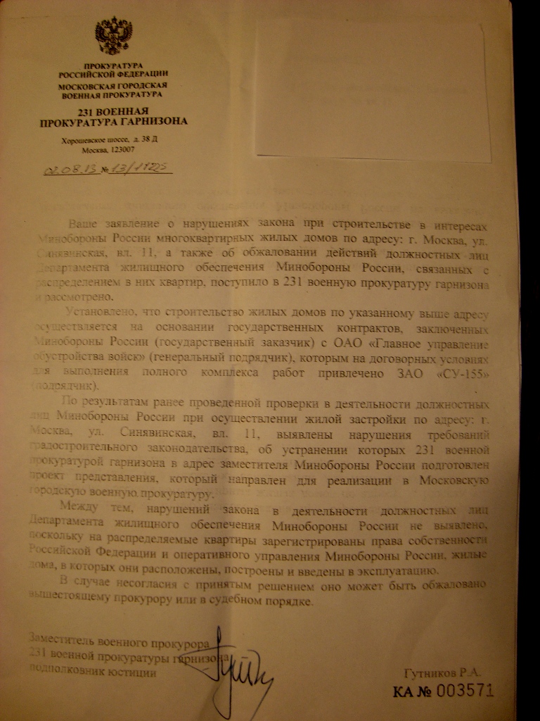 Всем привет. Дорогие друзья и сочувствующие, сегодня получил долгожданный ответ из МГВП, на моё обращение от 04 июня 2013 г. Конечно-же понятно , что это очередная отписка, только непонятно это: пункт 3 дословно "По результатам ранее проведенной проверки в деятельности должностных лиц Минобороны России при осуществлении жилой застройки по адресу: г. Москва, ул.Синявская, вл.11, выявлены нарушения требований градостроительного законодательства, об устранении которых 231 военной прокуратурой гарнизона в адрес заместителя Минобороны России подготовлен проект представления, который направлен для реализации в Московскую военную прокуратуру. Они, что там сума сошли, сами себе отправили.