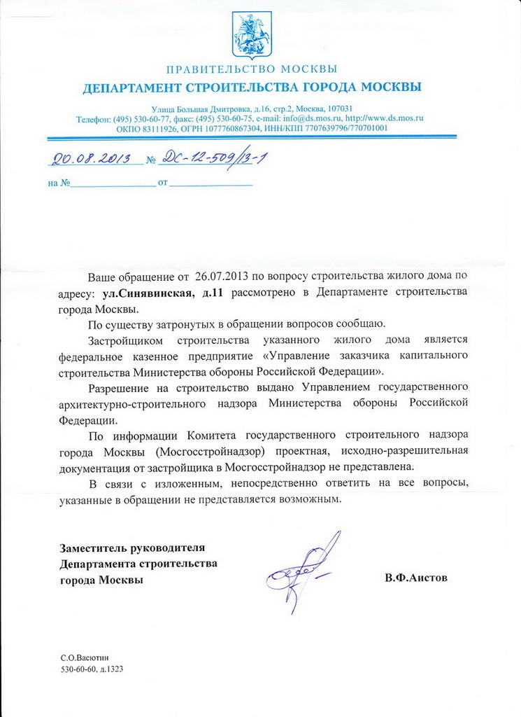 С такими вопросами надо обращаться в минобороны. Московские власти никакого отношения к стройке не имеют, о чем они Вам и сообщили. Можно с таким же успехом отправить запрос и в лигу наций.Возможно для кого-то будет полезно содержание приложенных, полученных мной, ответов Департамента строительства и Префектуры САО города Москвы по Синявинской д. 11.