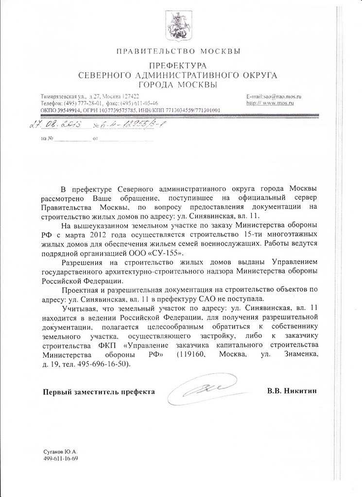 Возможно для кого-то будет полезно содержание приложенных, полученных мной, ответов Департамента строительства и Префектуры САО города Москвы по Синявинской д. 11.