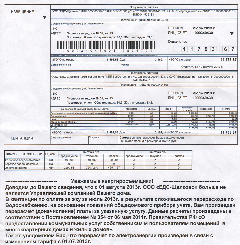 Сегодня, как и обещал, написал заявление в двух экземплярах и зарегистрировал их в УК ЕДС Щелково про то, что не собираюсь оплачивать непонятные перерасчеты, с приложением копии извещения, копии снятых в июле показаний счетчиков и копии оплаченной квитанции за июнь, также указал, что извещение получил 20 сентября, а дата платежа в ней указана "до 10 августа". И еще попросил в письменном (либо электронном) виде предоставить мне формулу этих перерасчетов с указанием конкретных данных, которые использовались в расчетах. Секретарша с этим заявлением меня сразу отправила к генеральному директору тов. Носову А.Г., который с первого раза не смог разобраться в представленных цифрах, вместе с ним сходили в бухгалтерию РКЦ где дама за компьютером немного потыкая в клавиши тоже не смогла ничего толком объяснить, тов Носов на этот момент сам не мог понять почему, если есть показания счетчиков, в графе "перерасчет" оказались вылиты и залиты лишние кубометры. После чего господин Носов пообещал мне разобраться с этим вопросом и об итогах этого "разбора" мне должны сообщить по телефону.