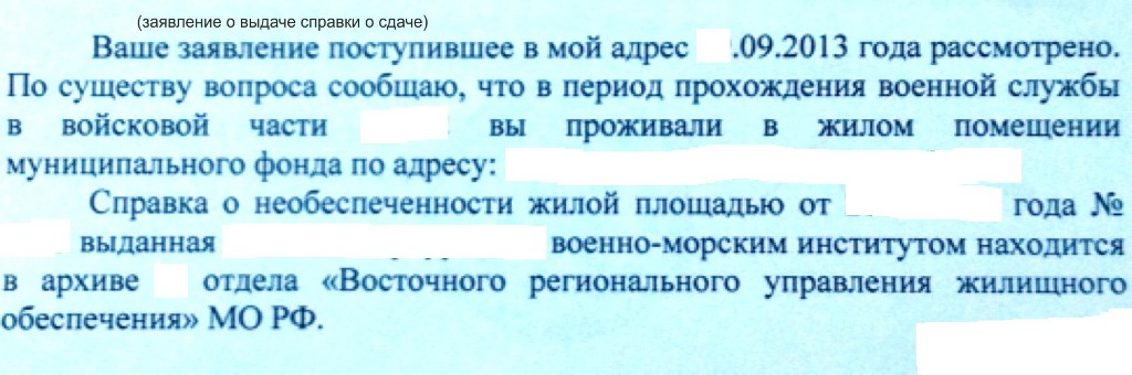 Собрав необходимый комплект документов,поехал в Восточное РУЖО, для получении справки о сдачи жилья. В РУЖО мне сказали, кому сдавали, пусть тот Вам и дает справку. Обратился к начальнику, он мне сказал, что раз я им жильё не сдал, справку о сдачи не дадим. Поговорили. Пришли к выводу,что они к муниципальному фонду ничего не имеют, вообщем оказался заложником ситуации. договорились. Во вторник должен получить справку в РУЖО, что в период службы был обеспечен муниципальным жильем, и что оно сдано в муниципалитет, а также что моя форма 1 (училищная) находится у них в архиве за номером .....