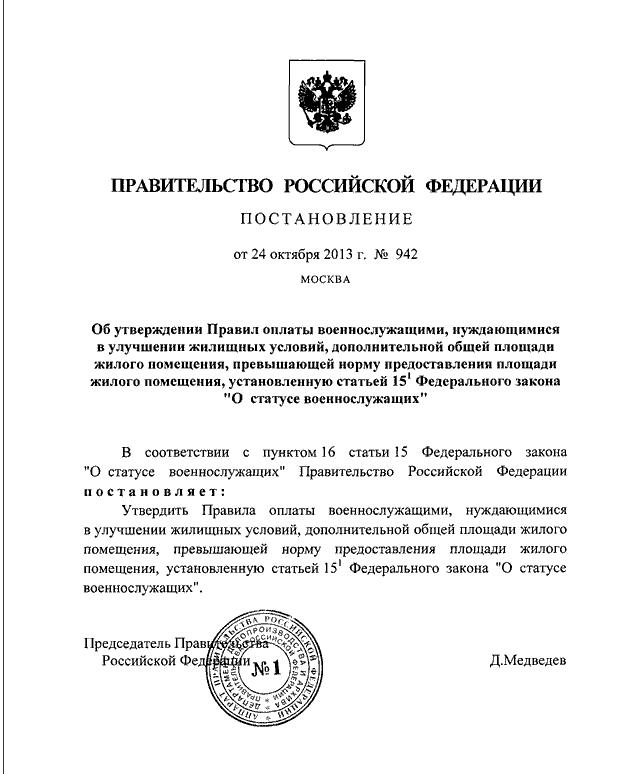 "Об утверждении Правил оплаты военнослужащими, нуждающимися в улучшении жилищных условий, дополнительной общей площади жилого помещения, превышающей норму предоставления площади жилого помещения, установленную статьей 15-1 Федерального закона "О статусе военнослужащих"....![]()